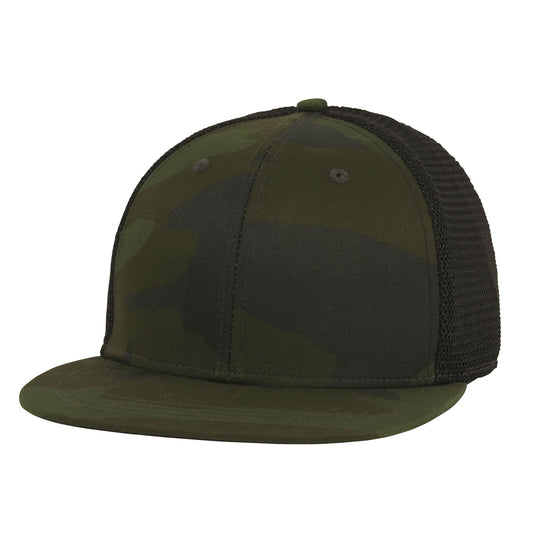 Mesh Back Midnight Woodland Camo Trucker Cap With Adjustable Strap and Flat Brim