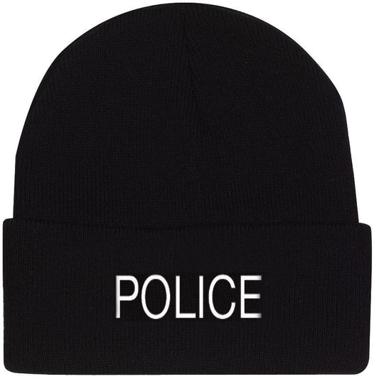 Black POLICE Watch Cap Ski Hat - White Embroidered Winter Hat 100% Acrylic