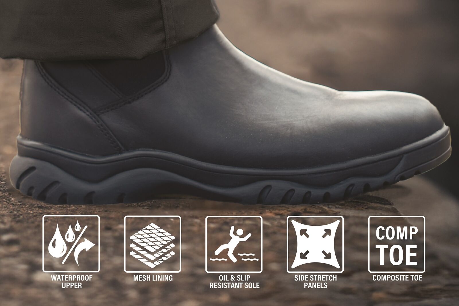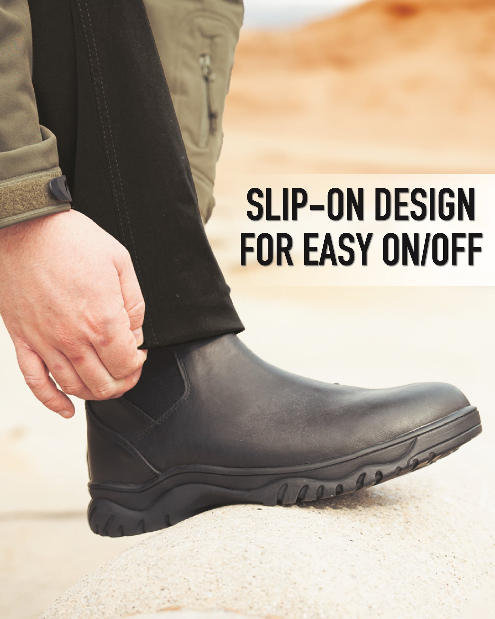 Start your day right with a step forward in our Chelsea Work Boots. Designed with full grain waterproof leather uppers, these slip on work boots keep your feet dry from the elements, while offering all-day comfort that stays with you.