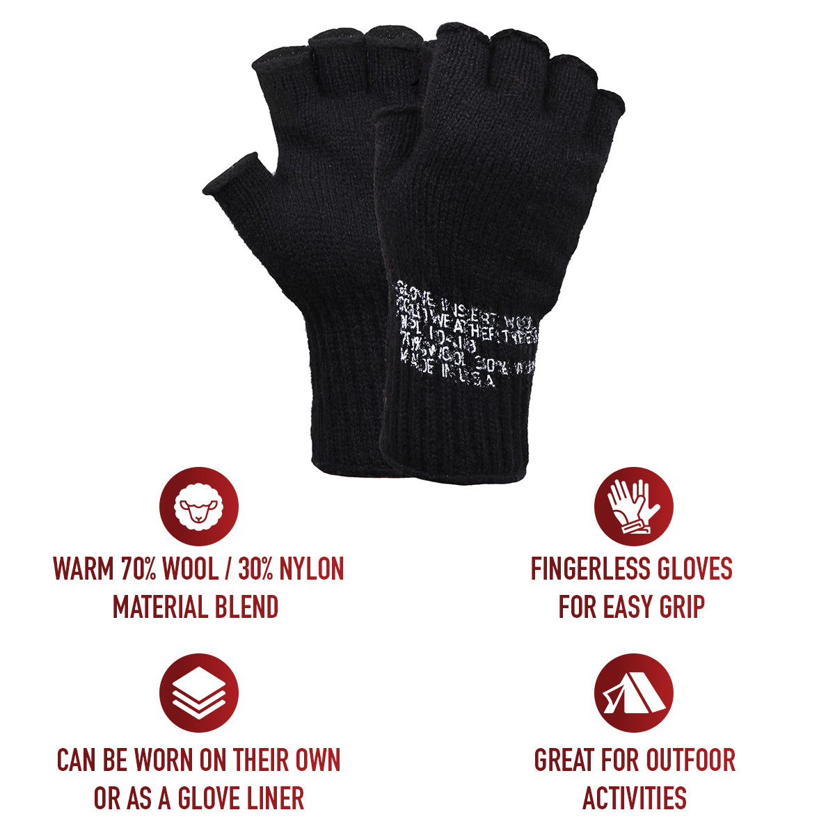 Stay warm and ready with Rothco's US-made wool fingerless gloves. Crafted from a blend of 70% wool and 30% nylon, they offer exceptional warmth without sacrificing dexterity. Perfect for outdoor tasks like hunting or fishing, these gloves feature a fingerless design for easy grip and versatility. Wear them alone or as glove liners for added warmth. Proudly made in the USA.